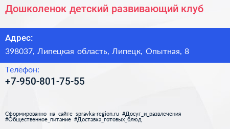 Дошколенок, детский развивающий клуб по адресу 398037, Липецкая область, Липецк, Опытная, 8 в дальнейшем Организация, размещена в следующих категориях: