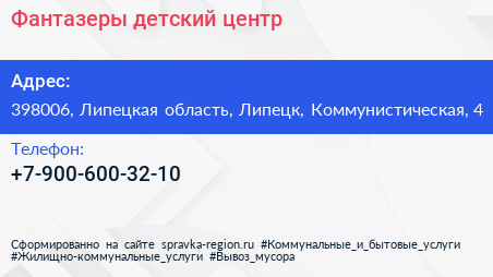 Фантазеры, детский центр по адресу 398006, Липецкая область, Липецк, Коммунистическая, 4 в дальнейшем Организация, размещена в следующих категориях:
