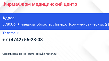 ФирмаФарм, медицинский центр по адресу 398006, Липецкая область, Липецк, Коммунистическая, 21 в дальнейшем Организация, размещена в следующих категориях:
