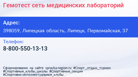Гемотест, сеть медицинских лабораторий по адресу 398059, Липецкая область, Липецк, Первомайская, 37 в дальнейшем Организация, размещена в следующих категориях: