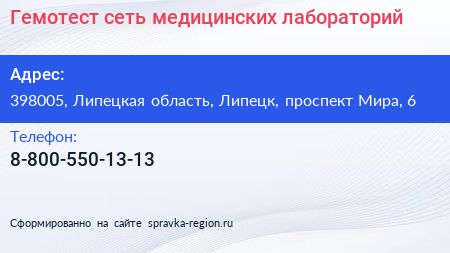 Гемотест, сеть медицинских лабораторий по адресу 398005, Липецкая область, Липецк, проспект Мира, 6 в дальнейшем Организация, размещена в следующих категориях: