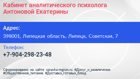 Кабинет аналитического психолога Антоновой Екатерины по адресу 398001, Липецкая область, Липецк, Советская, 7 в дальнейшем Организация, размещена в следующих категориях: