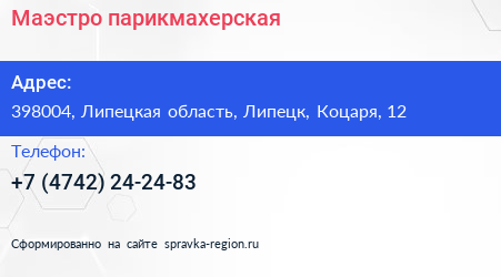 Маэстро, парикмахерская по адресу 398004, Липецкая область, Липецк, Коцаря, 12 в дальнейшем Организация, размещена в следующих категориях: