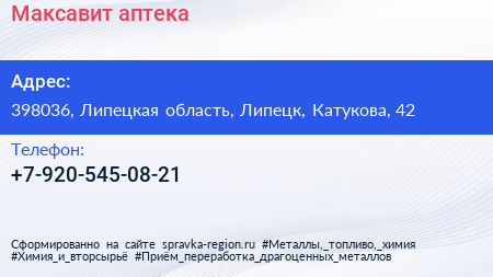 Максавит, аптека по адресу 398036, Липецкая область, Липецк, Катукова, 42 в дальнейшем Организация, размещена в следующих категориях: