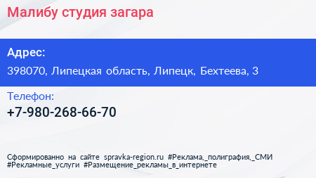 Малибу, студия загара по адресу 398070, Липецкая область, Липецк, Бехтеева, 3 в дальнейшем Организация, размещена в следующих категориях: