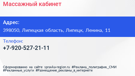 Массажный кабинет по адресу 398050, Липецкая область, Липецк, Ленина, 11 в дальнейшем Организация, размещена в следующих категориях: