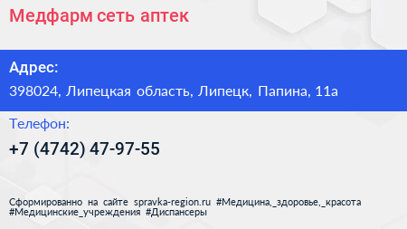Медфарм, сеть аптек по адресу 398024, Липецкая область, Липецк, Папина, 11а в дальнейшем Организация, размещена в следующих категориях: