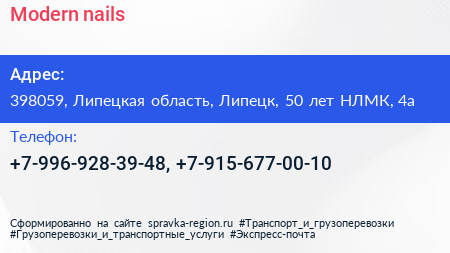 Modern nails по адресу 398059, Липецкая область, Липецк, 50 лет НЛМК, 4а в дальнейшем Организация, размещена в следующих категориях: