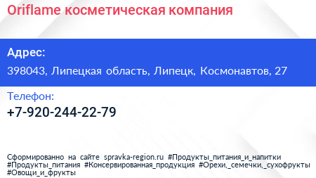 Oriflame, косметическая компания по адресу 398043, Липецкая область, Липецк, Космонавтов, 27 в дальнейшем Организация, размещена в следующих категориях: