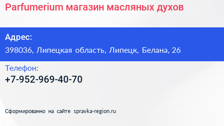 Parfumerium, магазин масляных духов по адресу 398036, Липецкая область, Липецк, Белана, 26 в дальнейшем Организация, размещена в следующих категориях: