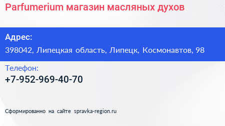 Parfumerium, магазин масляных духов по адресу 398042, Липецкая область, Липецк, Космонавтов, 98 в дальнейшем Организация, размещена в следующих категориях: