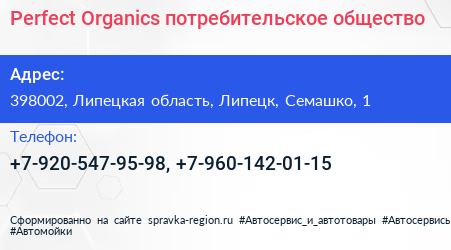 Perfect Organics, потребительское общество по адресу 398002, Липецкая область, Липецк, Семашко, 1 в дальнейшем Организация, размещена в следующих категориях: