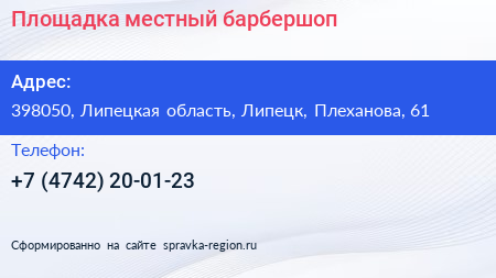 Площадка, местный барбершоп по адресу 398050, Липецкая область, Липецк, Плеханова, 61 в дальнейшем Организация, размещена в следующих категориях: