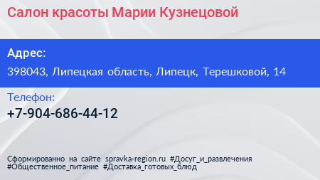 Салон красоты Марии Кузнецовой по адресу 398043, Липецкая область, Липецк, Терешковой, 14 в дальнейшем Организация, размещена в следующих категориях: