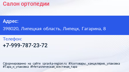 Салон ортопедии по адресу 398020, Липецкая область, Липецк, Гагарина, 8 в дальнейшем Организация, размещена в следующих категориях: