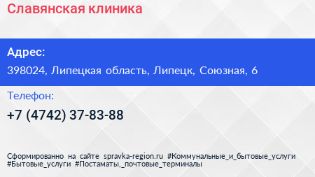 Славянская клиника по адресу 398024, Липецкая область, Липецк, Союзная, 6 в дальнейшем Организация, размещена в следующих категориях: