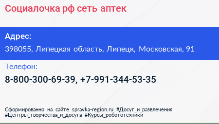 Социалочка.рф, сеть аптек по адресу 398055, Липецкая область, Липецк, Московская, 91 в дальнейшем Организация, размещена в следующих категориях:
