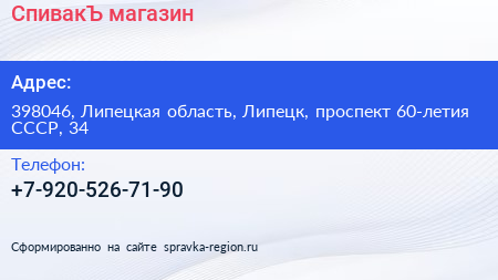 СпивакЪ, магазин по адресу 398046, Липецкая область, Липецк, проспект 60-летия СССР, 34 в дальнейшем Организация, размещена в следующих категориях: