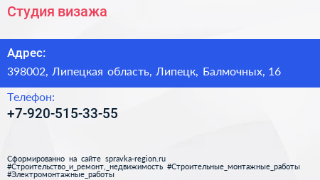 Студия визажа по адресу 398002, Липецкая область, Липецк, Балмочных, 16 в дальнейшем Организация, размещена в следующих категориях:
