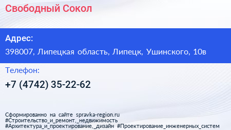 Свободный Сокол по адресу 398007, Липецкая область, Липецк, Ушинского, 10в в дальнейшем Организация, размещена в следующих категориях: