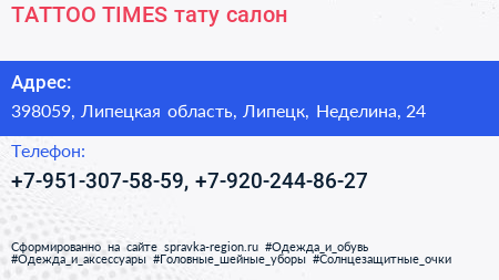 TATTOO TIMES, тату-салон по адресу 398059, Липецкая область, Липецк, Неделина, 24 в дальнейшем Организация, размещена в следующих категориях:
