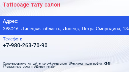 Tattooage, тату-салон по адресу 398046, Липецкая область, Липецк, Петра Смородина, 13а в дальнейшем Организация, размещена в следующих категориях: