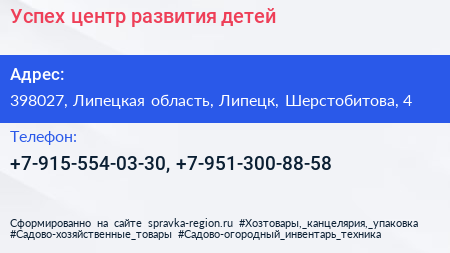 Успех, центр развития детей по адресу 398027, Липецкая область, Липецк, Шерстобитова, 4 в дальнейшем Организация, размещена в следующих категориях:
