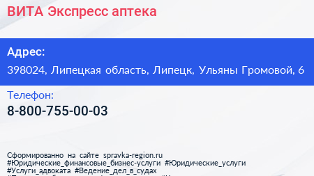 ВИТА Экспресс, аптека по адресу 398024, Липецкая область, Липецк, Ульяны Громовой, 6 в дальнейшем Организация, размещена в следующих категориях: