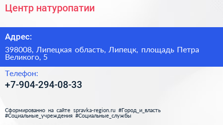 Центр натуропатии по адресу 398008, Липецкая область, Липецк, площадь Петра Великого, 5 в дальнейшем Организация, размещена в следующих категориях: