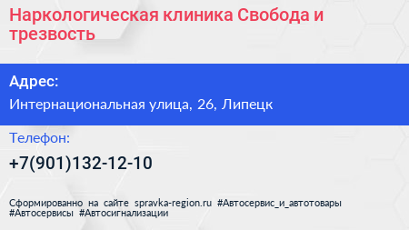 Наркологическая клиника “Свобода и трезвость” по адресу Интернациональная улица, 26, Липецк в дальнейшем Организация, размещена в следующих категориях: