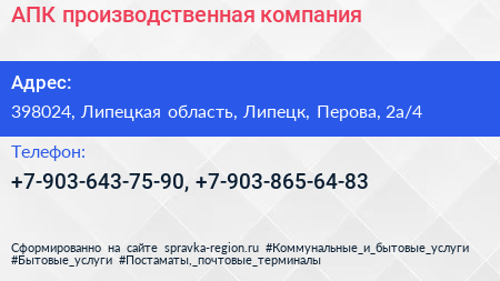 АПК, производственная компания по адресу 398024, Липецкая область, Липецк, Перова, 2а/4 в дальнейшем Организация, размещена в следующих категориях: