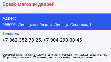 Браво, магазин дверей по адресу 398002, Липецкая область, Липецк, Семашко, 14 в дальнейшем Организация, размещена в следующих категориях: