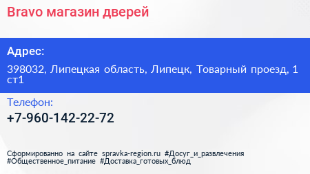 Bravo, магазин дверей по адресу 398032, Липецкая область, Липецк, Товарный проезд, 1 ст1 в дальнейшем Организация, размещена в следующих категориях: