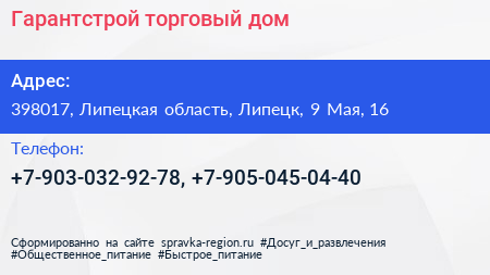 Гарантстрой, торговый дом по адресу 398017, Липецкая область, Липецк, 9 Мая, 16 в дальнейшем Организация, размещена в следующих категориях: