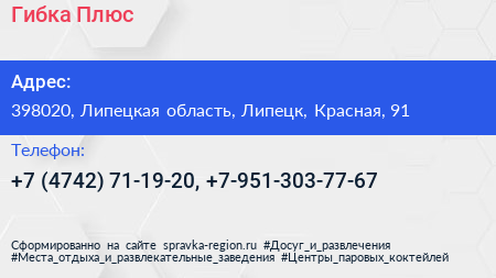 Гибка-Плюс по адресу 398020, Липецкая область, Липецк, Красная, 91 в дальнейшем Организация, размещена в следующих категориях: