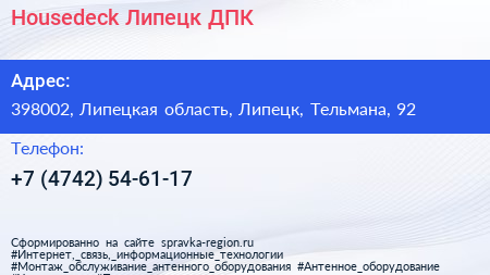 Housedeck Липецк ДПК по адресу 398002, Липецкая область, Липецк, Тельмана, 92 в дальнейшем Организация, размещена в следующих категориях: