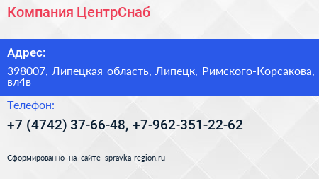 Компания ЦентрСнаб по адресу 398007, Липецкая область, Липецк, Римского-Корсакова, вл4в в дальнейшем Организация, размещена в следующих категориях: