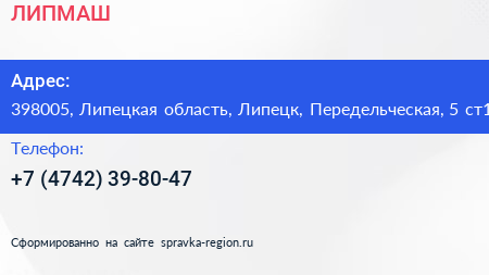 ЛИПМАШ по адресу 398005, Липецкая область, Липецк, Передельческая, 5 ст1 в дальнейшем Организация, размещена в следующих категориях: