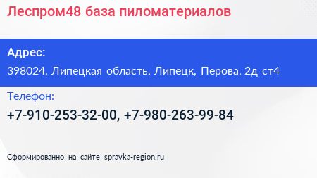 Леспром48, база пиломатериалов по адресу 398024, Липецкая область, Липецк, Перова, 2д ст4 в дальнейшем Организация, размещена в следующих категориях: