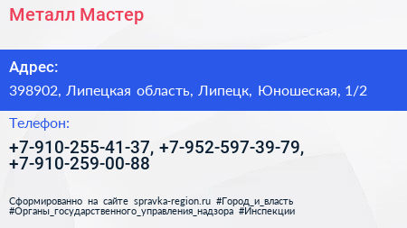 Металл Мастер по адресу 398902, Липецкая область, Липецк, Юношеская, 1/2 в дальнейшем Организация, размещена в следующих категориях: