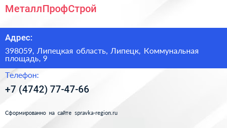 МеталлПрофСтрой по адресу 398059, Липецкая область, Липецк, Коммунальная площадь, 9 в дальнейшем Организация, размещена в следующих категориях: