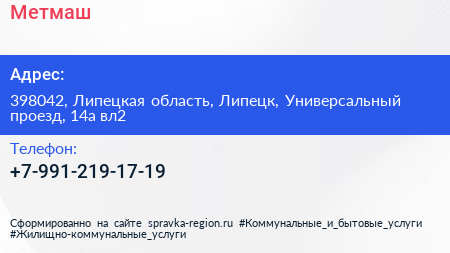 Метмаш по адресу 398042, Липецкая область, Липецк, Универсальный проезд, 14а вл2 в дальнейшем Организация, размещена в следующих категориях: