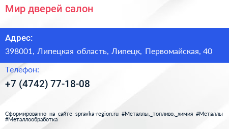 Мир дверей, салон по адресу 398001, Липецкая область, Липецк, Первомайская, 40 в дальнейшем Организация, размещена в следующих категориях: