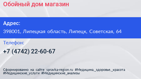 Обойный дом, магазин по адресу 398001, Липецкая область, Липецк, Советская, 64 в дальнейшем Организация, размещена в следующих категориях: