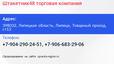 Штакетник48, торговая компания по адресу 398032, Липецкая область, Липецк, Товарный проезд, ст13 в дальнейшем Организация, размещена в следующих категориях: