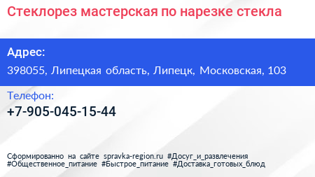 Стеклорез, мастерская по нарезке стекла по адресу 398055, Липецкая область, Липецк, Московская, 103 в дальнейшем Организация, размещена в следующих категориях:
