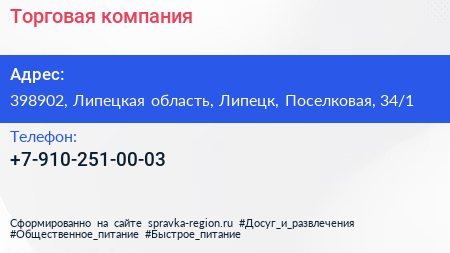 Торговая компания по адресу 398902, Липецкая область, Липецк, Поселковая, 34/1 в дальнейшем Организация, размещена в следующих категориях: