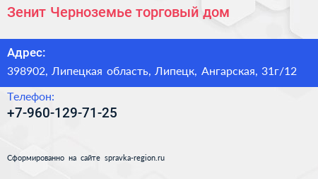 Зенит Черноземье, торговый дом по адресу 398902, Липецкая область, Липецк, Ангарская, 31г/12 в дальнейшем Организация, размещена в следующих категориях:
