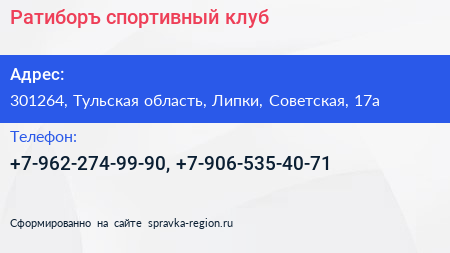 Ратиборъ, спортивный клуб по адресу 301264, Тульская область, Липки, Советская, 17а в дальнейшем Организация, размещена в следующих категориях: