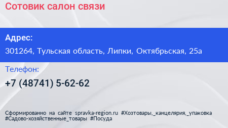 Сотовик, салон связи по адресу 301264, Тульская область, Липки, Октябрьская, 25а в дальнейшем Организация, размещена в следующих категориях: